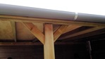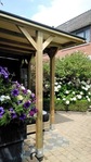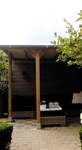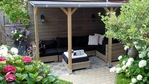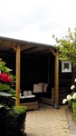 In een volgroeide tuin en aan een bestaande schuur is in één dag een veranda geplaatst. De palen (9x9 cm) staan stevig in de Betuwse klei en het dakje is gebrand met bitumineuze dakbedekking. De lounge-set werd op dezelfde dag bezorgd zodat we echt kunnen spreken over een tuin make-over.