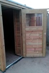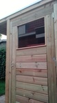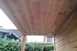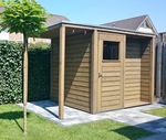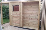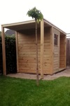 In het zuiden van de provincie Gelderland is een strak vormgegeven tuinhuis met luifeltje gerealiseerd. Vanwege de beperkte afmetingen van de tuin zijn de afmetingen van het tuinhuis ook bescheiden gehouden. Het dak ligt achter de dunne dakrand op afschot, zodat er geen regenwater op blijft staan.